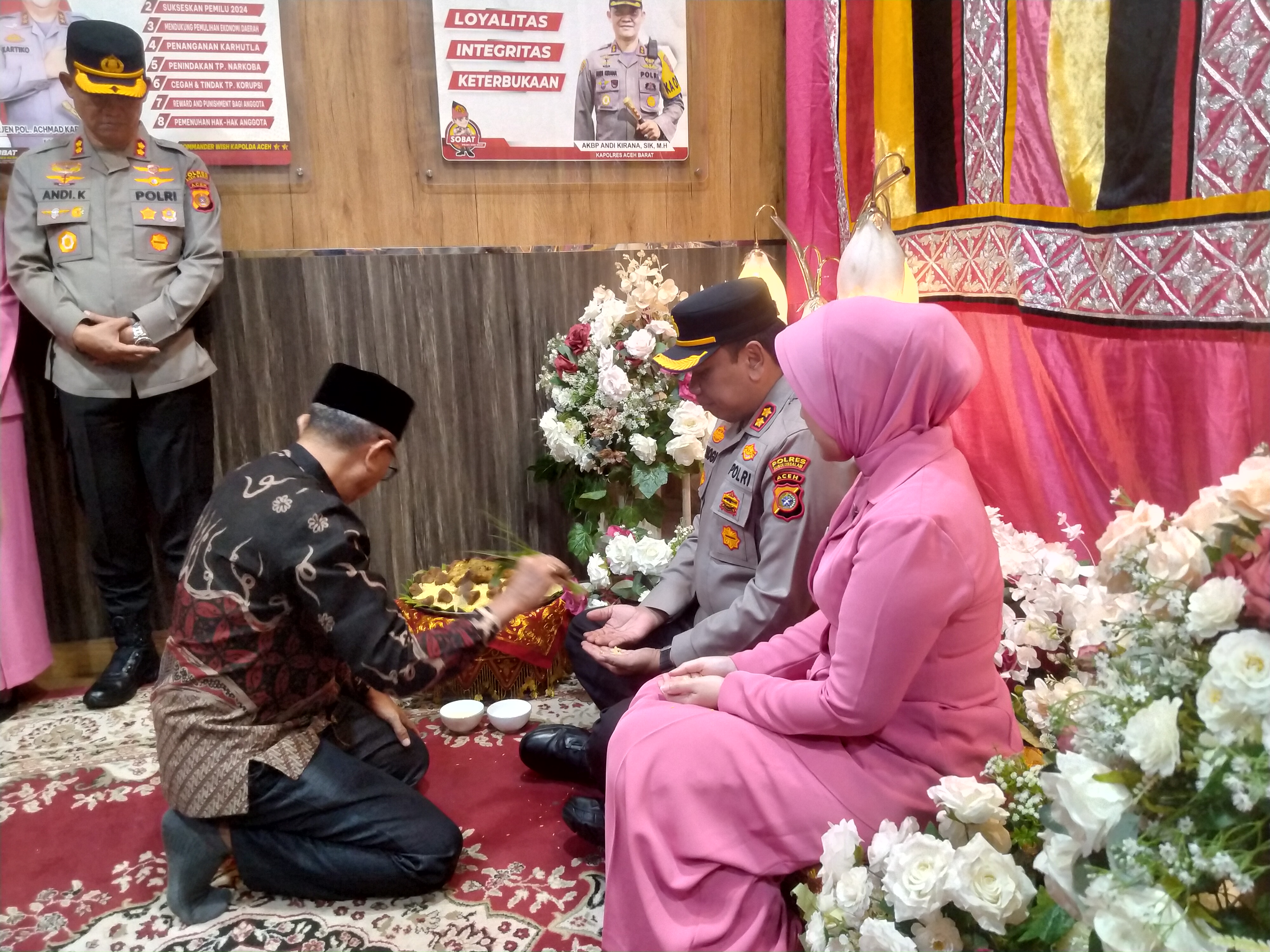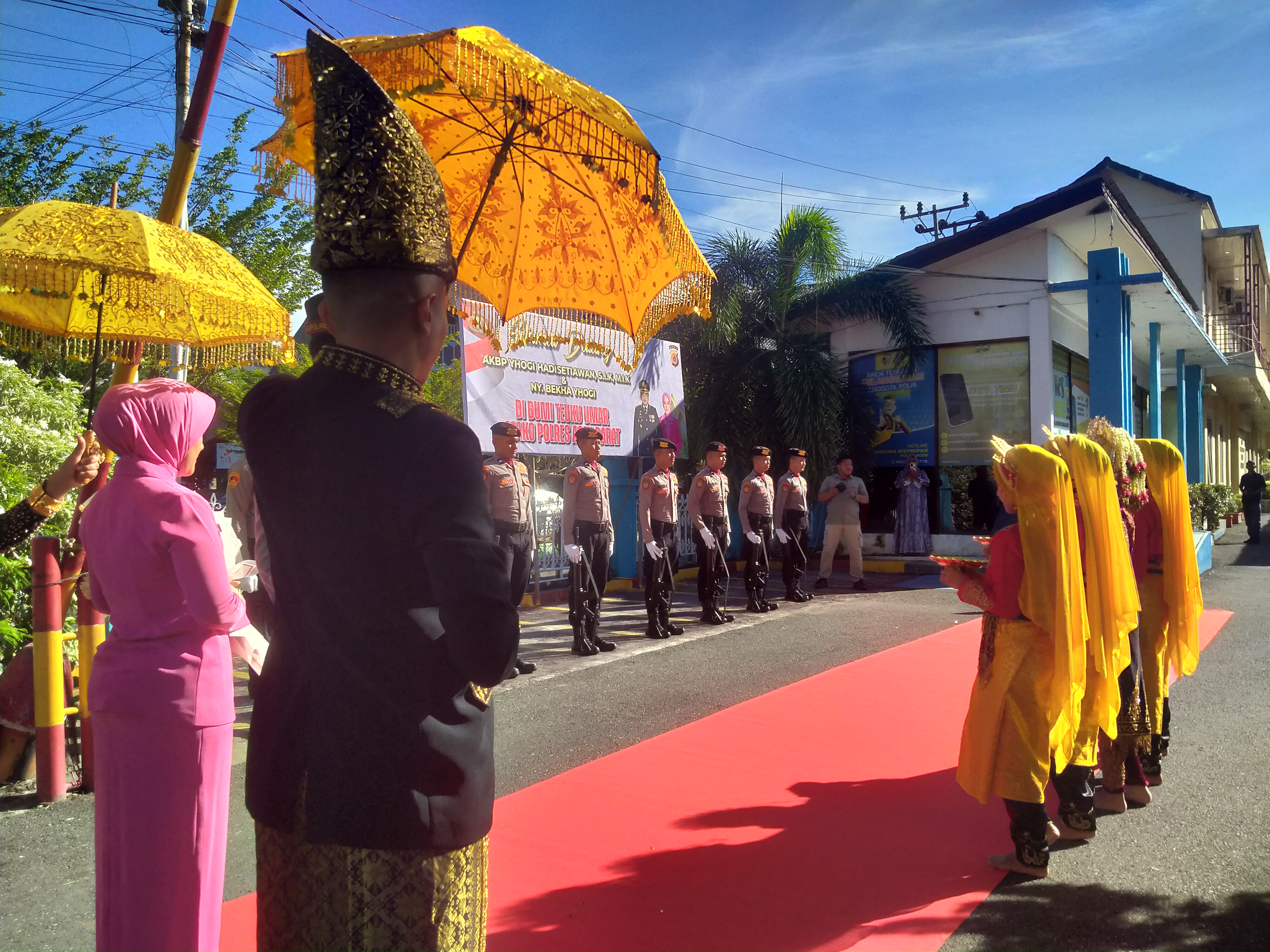 Kedatangan AKBP Yhogi Hadisetiawan di Mapolres Aceh Barat disambut dengan tarian Ranup Lampuan, salah satu tarian adat Aceh sebagai bentuk penghormatan dan penyambutan tamu kehormatan.