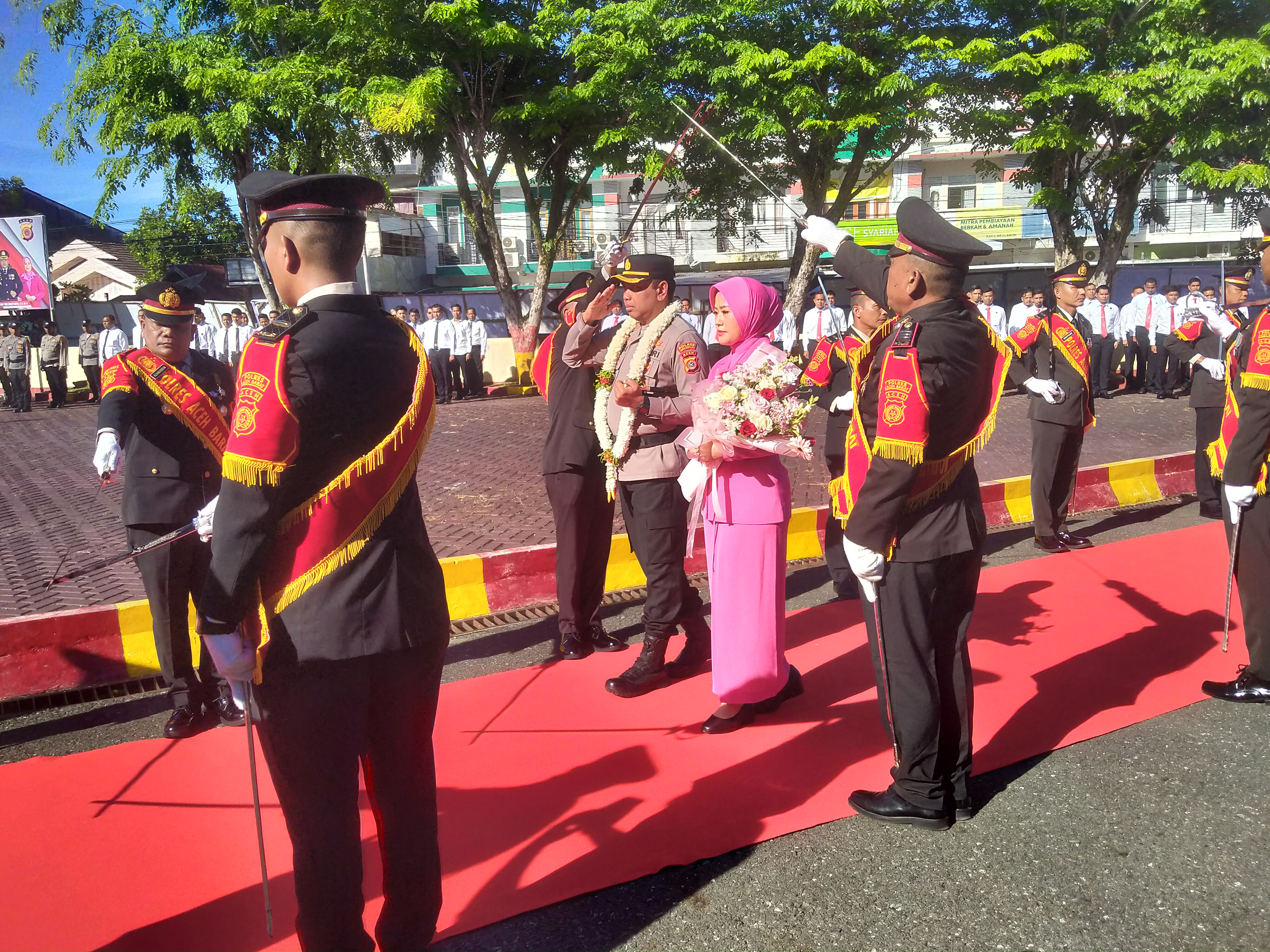 Selanjutnya, AKBP Yhogi berjalan melewati barisan penyambutan anggota Polres sebelum mengikuti prosesi adat Peusijuek atau tepung tawar, yang merupakan tradisi masyarakat Aceh sebagai bentuk doa dan harapan atas kelancaran tugas yang akan diemban di wilayah hukum Polres Aceh Barat.